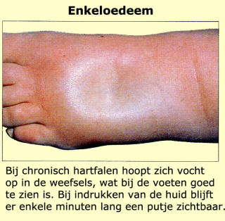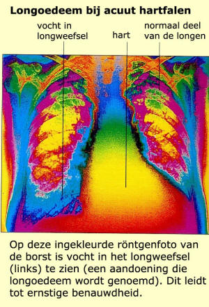 (NYHA)-classificatie: Behandeling Als de pompfunctie van het hart tekortschiet, heeft dat gevolgen voor andere organen. De aders (venen) in de bloedsomloop raken overvuld (stuwing). Allereerst is dat te merken in de longen omdat er benauwdheid ontstaat, er is dan sprake van longstuwing, waardoor vocht in de longen verschijnt (longoedeem). Maar ook de aders in de benen zijn vaak ‘gestuwd’, met als gevolg enkeloedeem. De stuwing is er ook de oorzaak van dat er minder bloed terugvloeit naar het hart, waardoor de slagaders weer minder bloed kunnen aanbieden aan de diverse organen. Vooral de nieren worden dan minder goed doorbloed en houden daardoor meer vocht vast. De patiënt zal dan minder plassen en zijn hart zal nog meer moeite hebben het bloed in het overvulde vaatsysteem rond te pompen. In sommige situaties is een behandeling mogelijk die de directe oorzaak van hartfalen wegneemt. Voorbeelden daarvan zijn de behandeling van hoge bloeddruk met bloeddrukverlagende medicijnen (zie ook bloeddrukverlagers bij hoge bloeddruk' in deze sectie 'Bloed & Bloedsomloop') of de chirurgische correctie van bepaalde hartklepgebreken. Een eventuele harttransplantatie is een zeer ingrijpende en vaak succesvolle behandeling van zeer ernstig hartfalen. Bij de meeste patiënten met hartfalen gaat het echter om een behandeling die de oorzaak niet oplost, maar toch resulteert in een betere kwaliteit van leven en/of een (bescheiden) verlenging van de levensduur. Algemene maatregelen bestaan uit strikte beperking van zout en vocht, alsmede rust dan wel gedoseerde inspanning. Het zwaartepunt van de behandeling van hartfalen ligt tegenwoordig op het gebruik van medicijnen.