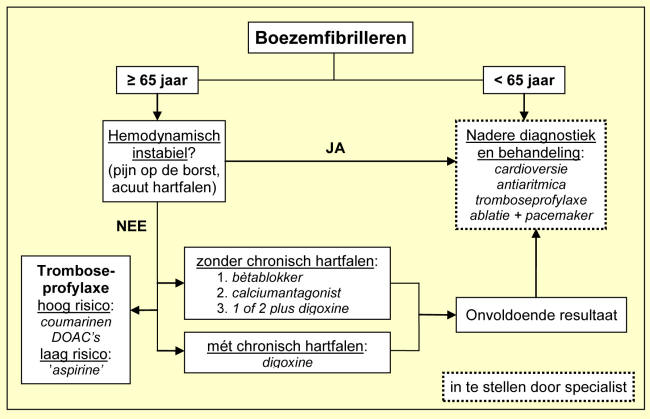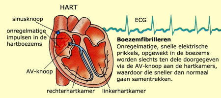 besproken, de meest voorkomende hartritmestoornis. Boezemfibrilleren (ook wel atriumfibrilleren genoemd) is een hartritmestoornis waarbij de boezems (atria) van het hart niet meer normaal samentrekken na een ontlading van de sinusknoop (de plaats in het hart waar de elektrische impulsen worden opgewekt die het normale hartritme bepalen, het zogenaamde sinusritme) maar veel te snel en onregelmatig. De hartfrequentie kan daarbij oplopen tot wel 180 slagen per minuut. Het hart blijft (in tegenstelling tot bij kamerfibrilleren) wel een groot deel van de vitale pompfunctie behouden omdat de kamers nog wel effectief werken, maar in een onregelmatig ritme. Doorgaans wordt onderscheid gemaakt tussen aanvalsgewijs (paroxysmaal) boezemfibrilleren (binnen 48 uur treedt herstel op van het hartritme) en chronisch boezemfibrilleren (langer dan 48 uur aanhoudend). De meest voorkomende oorzaken van boezemfibrilleren zijn hoge bloeddruk, (reumatische) hartklepafwijkingen, hartfalen, verhoogde schildklieractiviteit, diabetes (suikerziekte), fors alcoholgebruik, koortsende ziekten (met name longontsteking). In circa 10% van de gevallen is geen oorzaak te vinden. Boezemfibrilleren is vooral een ouderdomsziekte, met het stijgen van de leeftijd neemt de kans op boezemfibrilleren sterk toe. Bij 40- tot 45-jarigen komt de stoornis bij 1 op de 1000 personen voor, terwijl bij 80-jarigen of ouder de stoornis bij 1 op de 10 personen voorkomt. Boezemfibrilleren is merkbaar door een onregelmatige, meestal (veel) te snelle en daardoor onaangename hartslag en een vermindering van de hartpompfunctie van ca 20-30% waardoor de patiënt eerder kortademig wordt. Bij snelle hartritmes treden soms klachten van angina pectoris op als gevolg van zuurstoftekort in de hartspier. Verder kunnen patiënten zich zwak en duizelig voelen. Bij boezemfibrilleren pompen de boezems bij elke slag niet hun volledige inhoud naar de kamers. Op den duur kan daardoor bloed in de boezems achterblijven zodat daar stolsels kunnen ontstaan. Van een dergelijk stolsel kunnen stukjes losraken en via de linkerkamer in de bloedsomloop terechtkomen, waar ze dunne slagaders kunnen afsluiten. Dit heet trombo-embolie (zie ook trombose in deze sectie 'Bloed & Bloedsomloop'). Vaak laten stukjes stolsel los als het hart na boezemfibrilleren in een normaal ritme gaat kloppen, spontaan of na behandeling. Als een slagader in de hersenen hierdoor verstopt raakt, kan dit leiden tot een herseninfarct (zie ook beroerte in de sectie 'Hersenen & Zenuwstelsel'). Het risico hierop is circa vijfmaal hoger dan bij mensen zonder boezemfibrilleren. Behandeling De behandeling van boezemfibrilleren is erop gericht het normale hartritme te herstellen en te behouden en de aandoening te bestrijden die verantwoordelijk is voor de ritmestoornis. Om het ontstaan van stolsels en emboli te voorkomen zal tromboseprofylaxe moeten worden gegeven.