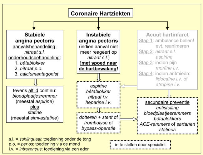 een rol spelen. Als een patiënt met klachten van pijn op de borst bij de (huis)arts komt, zal deze vaak al uit het verhaal kunnen afleiden of de klachten afkomstig zijn van het hart. Ook beoordeelt de arts het risico van de patiënt op hart- en vaatziekten aan de hand van het rookgedrag, bloeddruk, cholesterolgehalte, bloedsuikerspiegel. Indien nodig kan aanvullend onderzoek worden gedaan om de diagnose angina pectoris te bevestigen. Bijvoorbeeld het (laten) maken van een hartfilmpje (ECG = elektrocardiogram), waarbij een grafiek wordt gemaakt van de elektrische activiteit van het hart. De pijnaanval zal met wat rust meestal niet langer dan vijftien minuten duren. Men spreekt dan van stabiele angina pectoris. Duurt de aanval langer, dan zou het wel eens een beginnende hartinfarct kunnen zijn. Behalve van een drukkende, knijpende pijn midden op de borst, kan men last hebben van een uitstralende pijn naar de armen en de kaken. Waarschuw dan de huisarts of beter, laat u onmiddellijk naar de Eerste Harthulp bij u in de buurt brengen al dan niet met een ambulance (via 112). Als de pijnaanvallen in ernst toenemen en vaker optreden, ook in rust (vooral ’s nachts) - dus zonder aanleiding - spreekt men van instabiele angina pectoris of dreigend hartinfarct. Bij een snelle behandeling van instabiele angina pectoris gaat de dreiging van een hartinfarct in 80-90% van de gevallen voorbij. Toch is dan observatie nodig op de hartbewaking. Als blijkt dat er inderdaad sprake is van een dreigende hartinfarct, zullen dezelfde maatregelen moeten worden genomen als bij het acuut hartinfarct. Behandeling De behandeling is gebaseerd op het gegeven dat het optreden van angina pectoris de kans verhoogt op een hartinfarct en dus uiteindelijk een toegenomen sterfte tot gevolg heeft. Er wordt onderscheid gemaakt tussen een aanvalsbehandeling en een onderhoudsbehandeling. Bij de aanvalsbehandeling staat een nitraat (zie hieronder) centraal dat dan sublinguaal (onder de tong) wordt toegediend. De pijnklachten op de borst kunnen dan binnen enkele minuten worden gecoupeerd. Als meer dan twee aanvallen per week optreden, komt de patiënt voor een onderhoudsbehandeling in aanmerking. Oraal (via de mond) toegediende bètablokkers (zie hieronder) zijn hierbij de eerstekeuze middelen, alternatieven zijn langwerkende nitraten oraal (dus niet sublinguaal!) of calciumantagonisten. De bedoeling is hierbij om de frequentie van de aanvallen te verminderen en op de langere termijn is deze behandeling gericht op het voorkómen van een hartinfarct. De aanvalsbehandeling met een nitraat sublinguaal kan indien nodig hierbij worden voortgezet. Met genoemde medicijnen kan de zuurstofbehoefte van het hart worden afgeremd en de zuurstoftoevoer worden vergroot, waardoor de klachten verminderen of zelfs verdwijnen. Van de bètablokkers is ook vastgesteld dat ze tevens een gunstige invloed hebben op de prognose (instabiele angina pectoris, hartinfarct, sterfte). Naast deze middelen worden tegenwoordig ook altijd bloedplaatjesremmers en statines voorgeschreven om het risico op een (dreigend) hartinfarct nog verder te verminderen. De behandeling van instabiele angina pectoris is niet alleen gericht