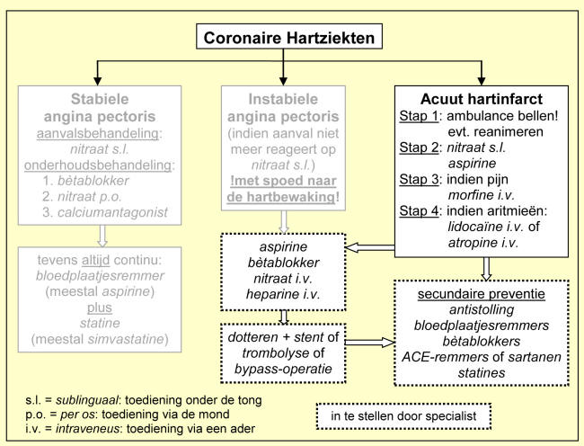 Acute behandeling Gezien de ernst van de aandoening is het duidelijk dat zeer snel ingrijpen van levensbelang is. De huisarts moet onmiddellijk worden gewaarschuwd. Als de diagnose een hartinfarct is, zal meteen een ambulance worden opgeroepen. Vervolgens dient hij meestal een nitraat toe (voor meer details zie nitraten bij angina pectoris' hierboven) via een tablet of spray voor onder de tong om het hart te ontlasten en de doorstroming van de kransslagaders te verbeteren: isosorbidedinitraat (merkloos, Isordil®) of nitroglyerine (merkloos, Nitrolingual®). Bij ernstige pijn geeft hij bovendien een injectie met een sterke pijnstiller. Vaak is dat morfine (merkloos). Ook doet de huisarts er verstandig aan de patiënt meteen de bloedplaatjesremmer acetylsalicylzuur (merkloos, Acetylsalicylzuur Cardio®, Acetylsalicylzuur Neuro®) of het calciumzout hiervan carbasalaatcalcium (merkloos, Ascal Cardio®, Carbasalaatcalcium Cardio®) - meestal kortweg aspirine genoemd - te laten slikken. Daardoor wordt de samenklontering van de bloedplaatjes geremd, de infarctzone beperkt en complicaties vermeden (voor meer details zie bloedplaatjesremmers bij trombose, elders in deze sectie 'Bloed & Bloedsomloop'). Als het hart (veel) te langzaam werkt (bradycardie), geeft de huisarts ook nog een injectie met atropine (merkloos) om de hartactie weer enigszins te versnellen. Zijn er daarentegen ernstige ritmestoornissen van de hartkamer, waardoor het hart op hol slaat, dan geeft hij lidocaïne (merkloos, Xylocaïne®), in afwachting van de behandeling die in het ziekenhuis zal worden ingesteld.