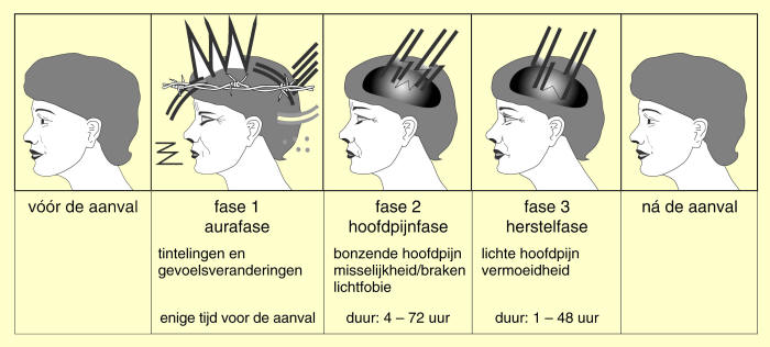 MIGRAINE Wereldwijd worden miljoenen mensen regelmatig gekweld door aanvallen van migraine; soms twee keer per jaar, maar ook wel twee keer per week. Zo’n aanval kan een paar uur duren, maar ook wel eens een paar dagen. Sommige patiënten vergelijken een migraineaanval met een bezoek aan de hel, waar een kwelgeest met een drilboor in hun hoofd boort (!). Migraine komt vaker voor dan we denken. Volgens schattingen lijdt ten minste één op de tien volwassenen in de westerse wereld aan migraine of aan een verwante kwaal die zware hoofdpijn veroorzaakt. Opvallend is dat tweemaal zoveel vrouwen als mannen er last van hebben. In Nederland betekent dit dat ruim een miljoen mensen regelmatig zware hoofdpijn hebben. Voorzichtig geschat rekent men jaarlijks op een arbeidsverlies van 4,5 miljoen werkuren, hetgeen de samenleving bijna een half miljard euro per jaar kost. Van de dertien soorten hoofdpijn is migraine er één. De hoofdpijn bij migraine is echter wel een van de zwaarste en meest angstaanjagende die er bestaat. De regelmatig terugkerende hoofdpijnaanvallen duren doorgaans 4 tot 72 uur en gaan vaak gepaard met duizeligheid, misselijkheid en overgeven, overgevoeligheid voor licht en geluid, verstoringen van het gezichtsvermogen, spierpijn, uitputting en depressie. De hoofdpijn zelf is kloppend, zit meestal aan één kant en wordt erger bij lichamelijke inspanning. Soms wordt de hoofdpijn voorafgegaan door zeer aparte sensaties. Men ziet dan sterretjes en lichtflitsen, of heeft een doof gevoel in de handen of rond de mond of tintelingen. Deze sensaties worden ‘aura’s’ genoemd. Al heel lang heerst het misverstand dat vooral verwende vrouwen en begaafde mannen uit betere kringen, of mensen met veel ambitie en een grote hang naar perfectie last van migraine hebben. Zo langzamerhand is echter duidelijk dat een ‘migrainepersoonlijkheid’ niet bestaat. Wel is er een zekere erfelijke aanleg voor migraine. En ook is duidelijk dat stress en spanningen aanvallen kunnen uitlokken. Maar in principe kan iedereen op elke leeftijd een migraineaanval krijgen.