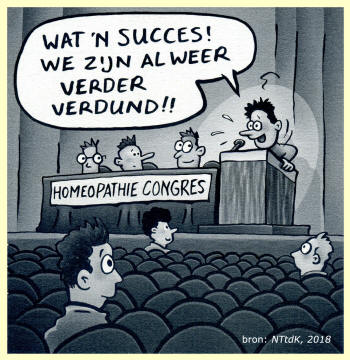 probiotica vallen in deze categorie. Homeopathische middelen De Duitse arts Hahnemann (1755-1843) ontwikkelde een vreemdsoortige geneesmiddelleer, gebaseerd op het idee dat je zieken kan behandelen met ultra-geringe hoeveelheden verdunde stof, waarbij die stof toegediend aan gezonde proefpersonen de symptomen van die ziekte konden opwekken. Het homeopathische middel wordt tijdens de bereiding telkens in stappen van meestal 1 op 10 verdund en tussen de verdunningen meermalen krachtig geschud. Men herkent de middelen en hun verdunningsgraad aan de afkortingen D10, K20, C30 etc. Als je kan uitrekenen dat er van de oorspronkelijke stof (de ‘oertinctuur’, die zowel plantaardig, dierlijk als mineraal kan zijn) geen molecuul meer in het middel aanwezig is, dan meent de homeopaat dat het spul toch werkt omdat de ‘energie’ van de stof in het oplosmiddel is overgegaan. De veiligheid wordt verklaard door de grote verdunning, die gepaard zou gaan met versterking (’potentiëring’) van de goede werking maar tegelijkertijd - oh, wonder - met een vermindering van de bijwerkingen. Door betreurenswaardige wetgeving heeft in ons land een beperkt aantal middelen toestemming gekregen een indicatie te voeren, zonder dat de werking bij die indicaties op normale manier is aangetoond. Bekende homeopathica zijn Oscillococcinum, Nysileen, SRL-gelei, Arnica en Echinaforce. Kruidenmiddelen Kruiden (ook wel